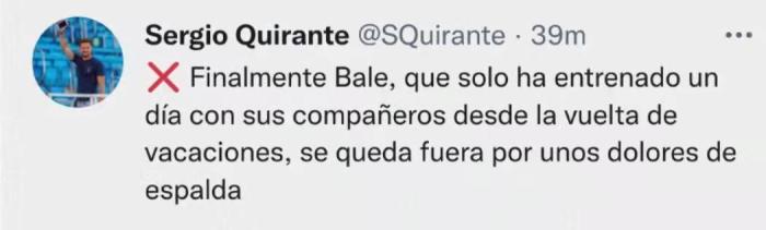据记者SergioQuirante透露,贝尔从度假回来后只和队友一起训练了一天,最后因为背部疼痛离开了。