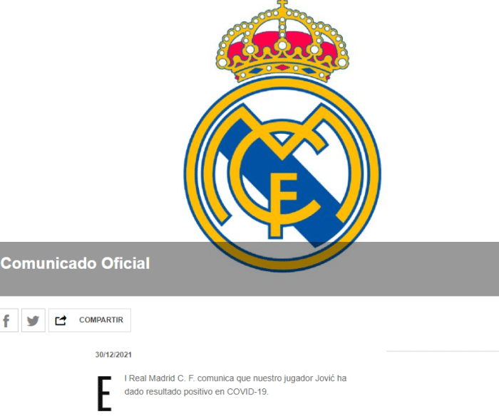 直播车12月31日讯 据皇马官方消息,球队前锋约维奇新冠检测呈阳性。