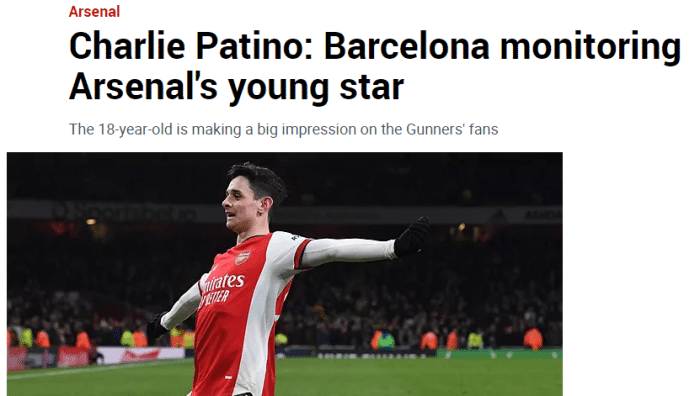 直播车12月26日讯 据《马卡报》报道,巴萨正在关注阿森纳小将查理-帕蒂诺。