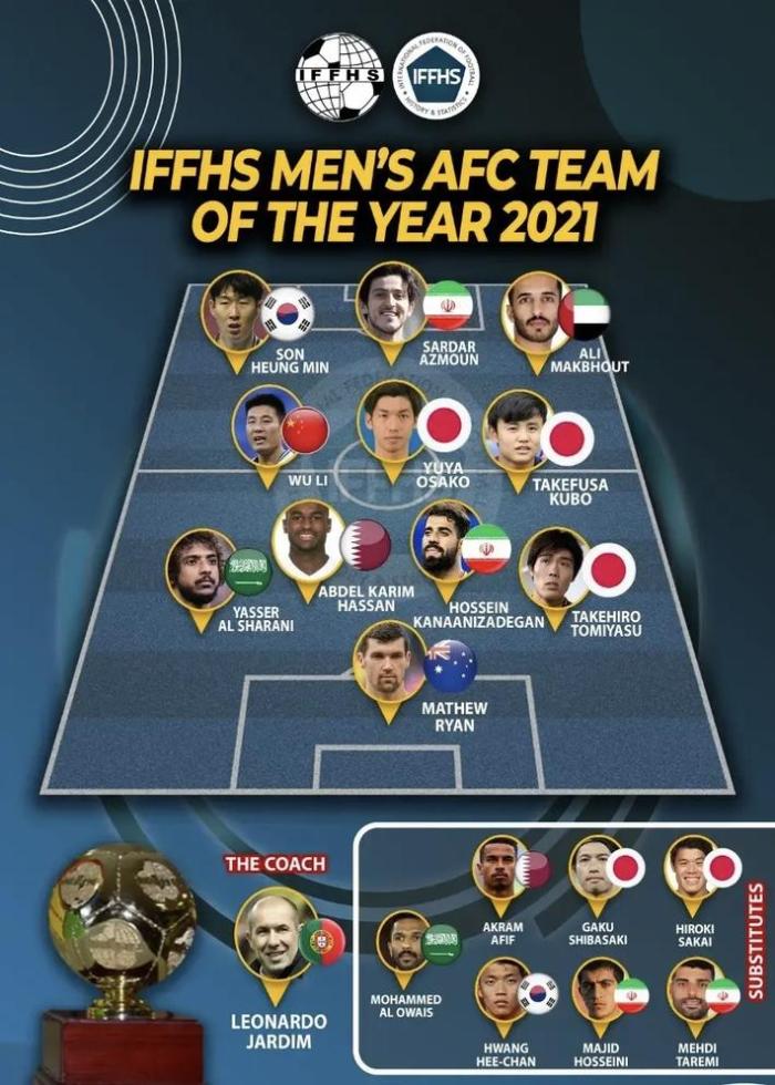 来源:直播车12-25 21:02直播车12月25日讯 近日,IFFHS(国际足球历史和统计联合会)公布了2021年度亚足联最佳阵容,武磊、孙兴慜在列。
