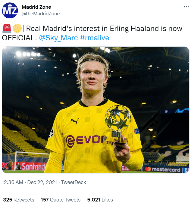 直播车12月22日讯 据德国天空体育记者马克-贝赫伦贝克报道,皇马已经正式向哈兰德表达了兴趣。