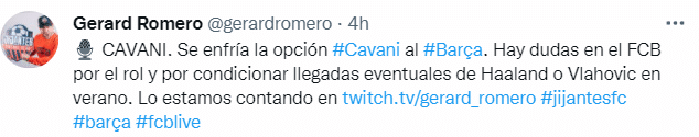 但杰拉德-罗梅罗透露,这笔交易的谈判现在已经停止,因为巴萨对卡瓦尼的身体状况和将在球队扮演的角色有所怀疑,同时他们也认为签下卡瓦尼会让俱乐部明夏引进哈兰德或弗拉霍维奇变得复杂。