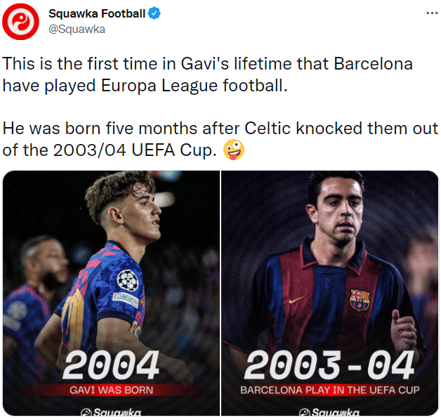 Squawka表示,巴萨上一次踢欧联杯已经是2003-04赛季的事情,那个赛季他们在赛事中被凯尔特人淘汰,五个月后加维才出生。