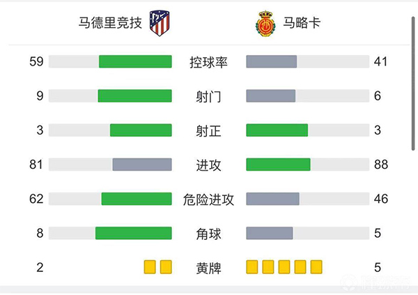 第80分钟,马洛卡扳平比分,鲁索接队友定位球高高跃起头球攻门,皮球飞入球门死角,马洛卡1-1马竞。