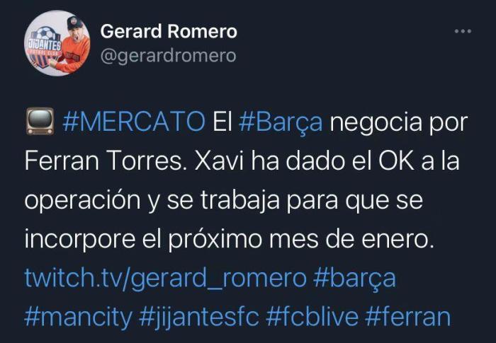 罗梅罗表示,巴萨与曼城正在就费兰-托雷斯的转会进行谈判,巴萨主帅哈维已经同意了这笔交易,巴萨方面希望冬窗就将费兰-托雷斯引进。