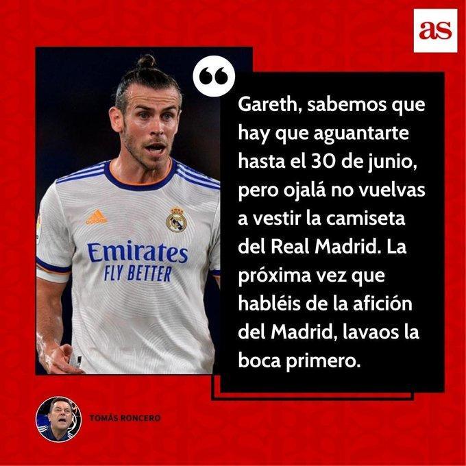 《阿斯报》主编TomasRoncero回击贝尔和巴内特:“下次谈论皇马球迷之前,你先漱漱口。我会为贝尔设计一面旗帜,并把他带到皇马和皇家社会的比赛中,旗帜上写贝尔滚粗皇马。”