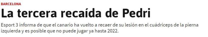 直播车11月20日讯 据西班牙媒体《阿斯报》报道,佩德里将不会出战加泰德比。