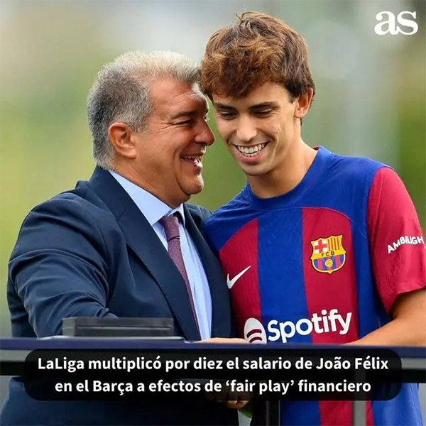 直播车01月08日讯 西甲主席哈维尔-特巴斯证实,巴塞罗那出于公平竞赛的目的,将若昂和俱乐部之间达成的薪酬乘以10。该协议意味着菲利克斯现在的年薪为344.44万英镑。