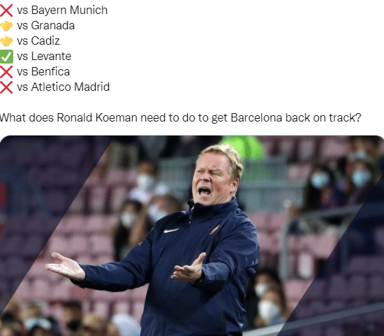 直播车10月03日讯 根据数据统计,巴萨最近6场各项赛事只取得1场胜利,状态相当糟糕。