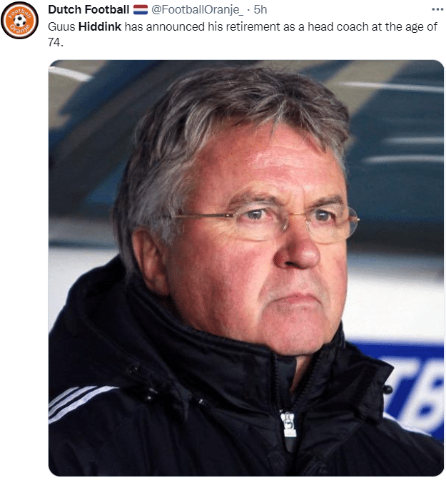 现年74岁的希丁克在1984年开始担任埃因霍温助理教练,他最近的一份工作是库拉索国家队主帅,但希丁克表示自己已经与库拉索足协主席谈过,将不再执教球队,而且也不会重返这个行业。