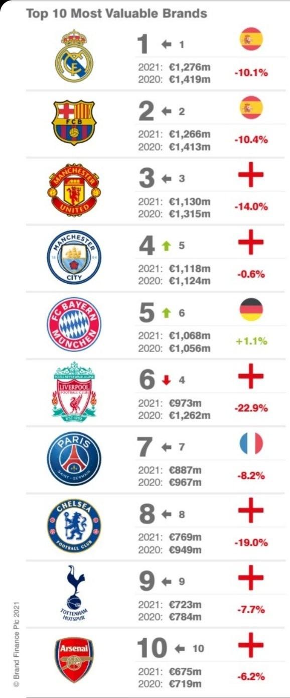 来源:直播车08-25 15:26直播车讯 谁是足坛最有价值的俱乐部?当然是西甲的皇家马德里,他们是20世纪最成功的俱乐部,也是本世纪截止目前最成功的俱乐部。而近日,BrandFinance公布了2021年足坛俱乐部价值排行榜,其中皇马位居榜首,巴萨排名第二,曼联位居第三。而因为YQ的影响,大部分俱乐部的价值都有所下降,前十的俱乐部中,只有拜仁一家球队的价值上涨了。