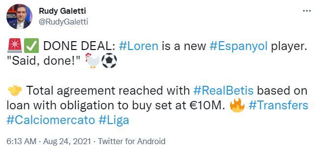 直播车讯 据意大利记者Rudy Galetti报道,西班牙人已经敲定了贝蒂斯前锋莫隆的交易。
