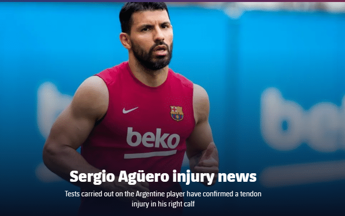 官方:阿圭罗右小腿肌腱受伤,缺席10周