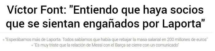 “我们都知道巴萨续约削减工资支出,拉波尔塔说我们的情况非常糟糕,可据我所知没有那么糟糕。在竞选主席时,我们有一系列的办法可以解决问题,我理解大家觉得被拉波尔塔骗了。因为当时大家都认为拉波尔塔可以扭转这局面,事实证明此前的成功没什么参考价值。”