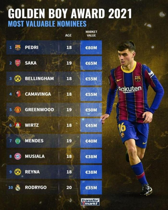直播车讯 消息,德国转会市场网公布了今年金童奖候选人的身价排行,巴塞罗那新星佩德里以8000万欧元居首。