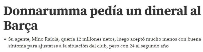 《世体》表示,在得知唐纳鲁马不与AC米兰续约时,巴萨是有签下他的意图的,他们联系了唐纳鲁马的经纪人拉伊奥拉,但是对方索要1200万欧元的年薪,这与巴萨本赛季缩减工资开支的政策是不符的。