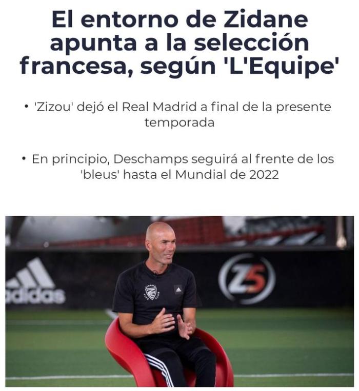 来源:直播车07-10 10:24直播车讯 西班牙塞尔电台援引法国队报的消息称,齐达内拒绝了英格兰、东亚和中东国家的邀请,希望执教法国队。