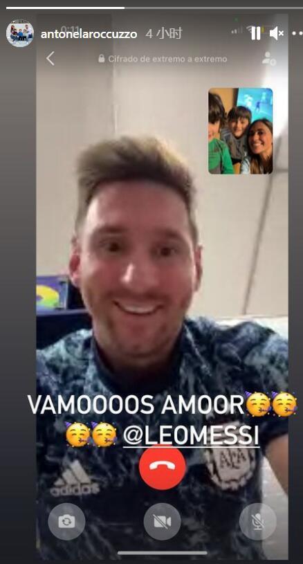 直播车讯 赛后,梅西第一时间与妻子和三个儿子通视频电话,分享自己胜利的喜悦。妻子安东内拉则是将视频截图分享到个人社交媒体,并对梅西示爱:加油我的爱!
