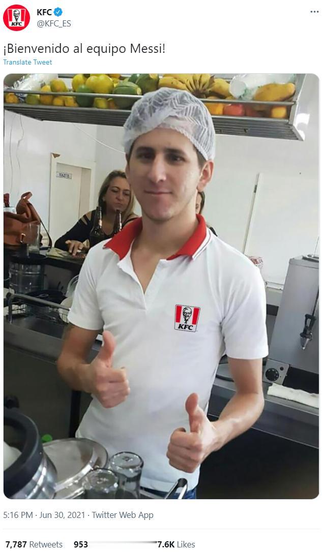 肯德基晒出了一张长相酷似梅西的员工的照片,并写道:“欢迎来到梅西的球队。”