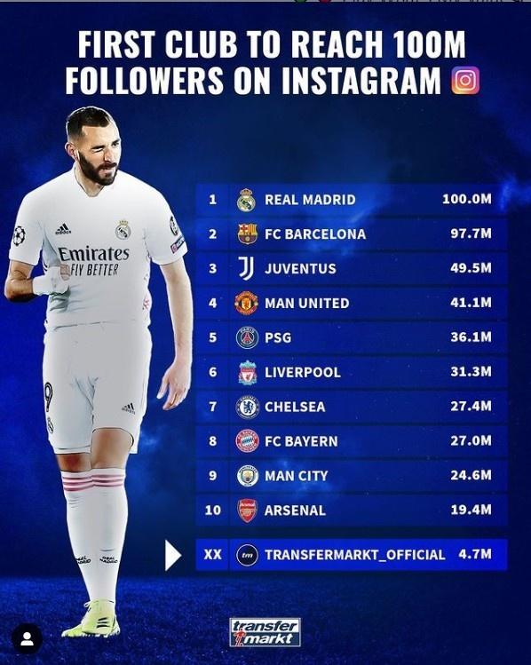 直播车讯 北京时间昨天,皇马官方ins账号粉丝量达到1亿,皇马成为世界上第一家Instagram粉丝破亿的俱乐部。今天《德国转会市场》列出了各大豪门ins粉丝数量。