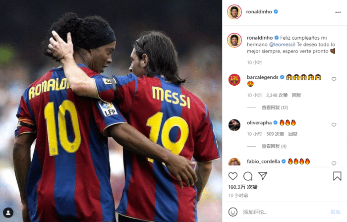 直播车讯 梅西昨天迎来34岁生日,前队友罗纳尔迪尼奥在Instagram上发文祝贺,并晒出两人的昔日合照。
