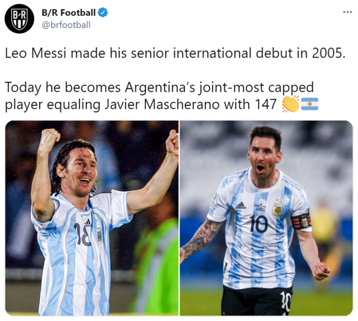 自2005年完成阿根廷国家队首秀以来,梅西已经为潘帕斯雄鹰出场147次,因此他也追平了马斯切拉诺保持的阿根廷国家队出场纪录。