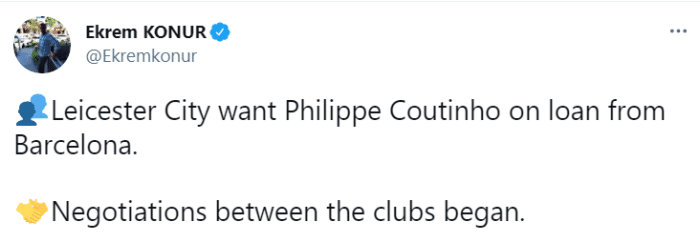 该记者表示,莱斯特城想要从巴萨租借库蒂尼奥,双方已经展开谈判。