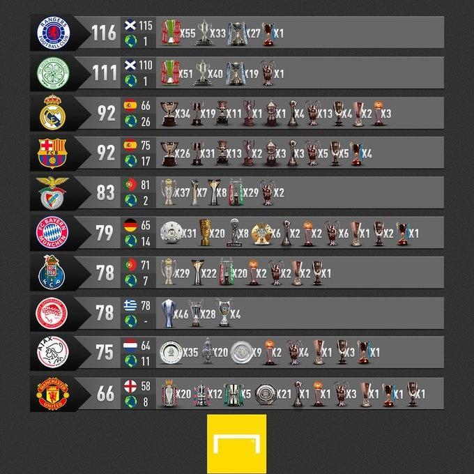 直播车讯近日,进球网统计了到目前欧洲足坛俱乐部的冠军排行榜,苏超两大豪门流浪者和凯尔特人排名前二,皇马、巴萨均是92冠并列第三。