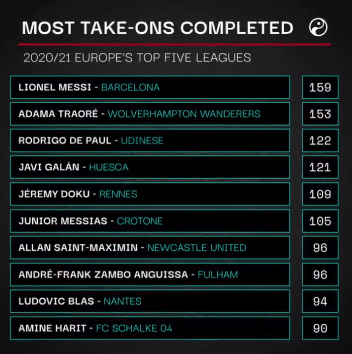 五大联赛过人榜: 梅西159次第一, 特劳雷第二
