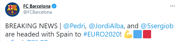 直播车讯 ,来自巴萨的布斯克茨、佩德里和后卫阿尔巴入选2020欧洲杯西班牙队大名单,巴萨官网对此表示了祝贺。