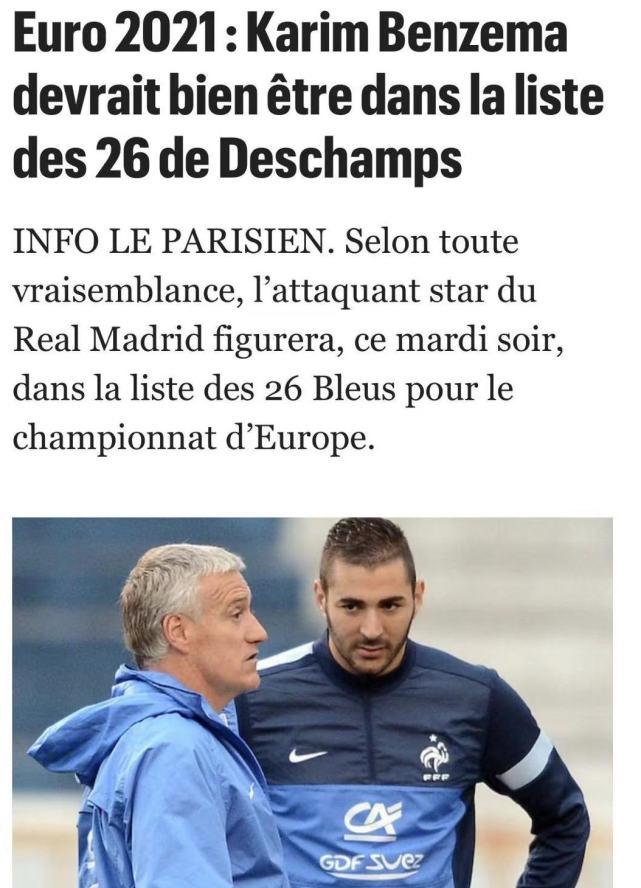 来源:直播车05-18 19:44直播车讯 此前,法国知名媒体《队报》曾发文称,关于本泽马回归国家队的话题,已不再是法国男足的禁忌,也许名单中会出现皇马前锋的身影。而北京时间5月18日晚,法国另外一家权威媒体《巴黎人报》也跟进了报道,本泽马确实“极有可能”会进入到德尚的法国男足国家队参加欧洲杯的26人大名单中。