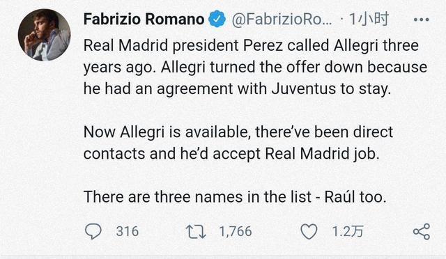 罗马诺表示,弗洛伦蒂诺三年前就曾邀请阿莱格里执教,但由于当时他和尤文已经就留任达成了协议,所以拒绝了邀约。现在皇马再一次与赋闲在家的阿莱格里进行接触,他愿意接受皇马的邀请。