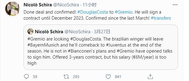 直播车讯 5月15日记者尼科洛-斯基拉消息,格雷米奥已经完成了道格拉斯-科斯塔的转会。