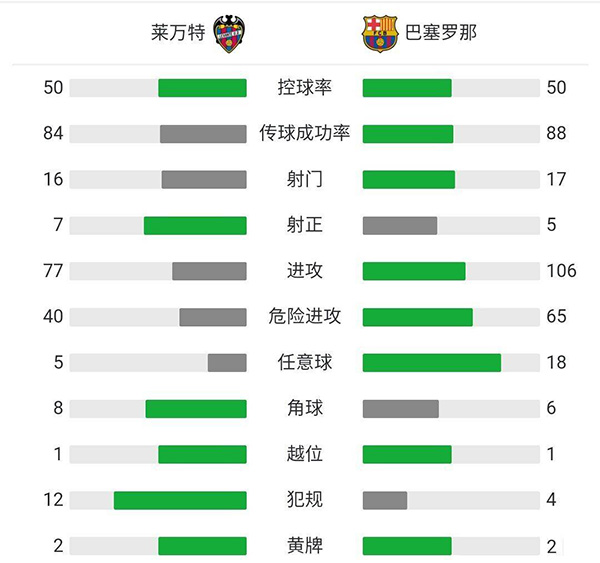 全场比赛结束,莱万特3-3巴塞罗那。