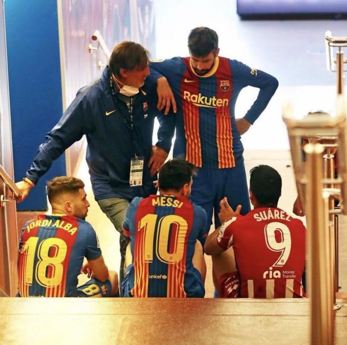 照片中,苏亚雷斯和梅西以及阿尔巴一起坐在地上聊天,皮克则站在一旁聆听,让许多球迷想起他们曾经并肩作战的场面。