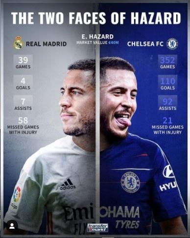 皇马时期,他各项赛事共出战39场,只有4个进球7次助攻,表现一落千丈,还饱受伤病困扰,因伤缺席场次是切尔西时期的近三倍,达到了58场。