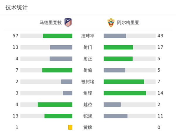 第17分钟,马竞取得领先,格列兹曼左路横传,莫拉塔得球领过防守球员,随后又过掉门将,小角度破门,马竞1-0领先阿尔梅里亚。