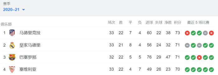 今天凌晨,马竞在西甲联赛中输球,而巴萨则逆转取胜,目前马竞以2分优势领跑积分榜,皇马同轮次排名第二,巴萨少赛一轮排名第三,塞维利亚排名第四,与马竞也只相差3分。