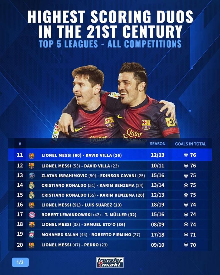 从前十的数据来看,除了莱万和格纳布里,几乎都是梅罗在霸榜。而再往后看,情况依然如此。第11是12-13赛季梅西和比利亚的组合以及10-11赛季梅西和比利亚的组合,都打进76球。第十三是15-16赛季伊布和卡瓦尼的组合、13-14赛季以及12-13赛季C罗和本泽马的组合,他们都打进了75球。第16是18-19赛季梅西和苏亚雷斯的组合、08-09赛季梅西和埃托奥的租借,以及15-16赛季莱万和穆勒的组合,他们都打进74球。随后是17-18赛季萨拉赫和菲尔米诺的组合,他们打进71球。第20是09-10赛季梅西和佩德罗的组合,他们打进70球。