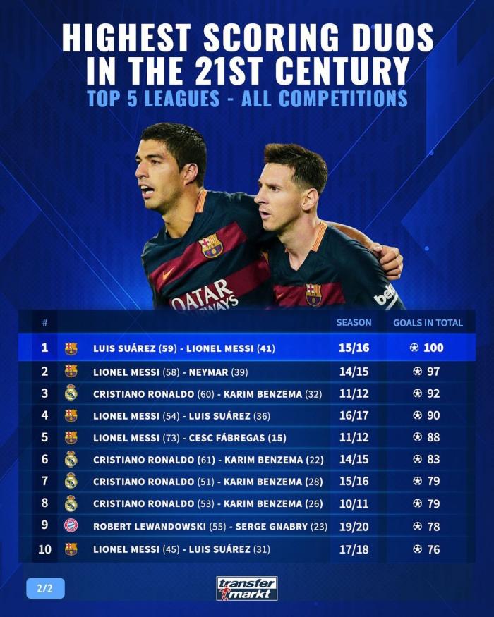 足坛本世纪单赛季进球最多二人组:前十梅罗占九席,另一个是谁?