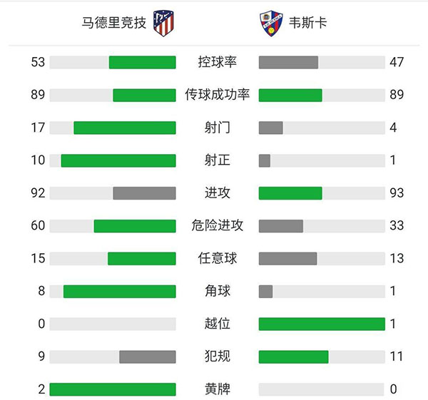 全场比赛结束,马德里竞技2-0韦斯卡。