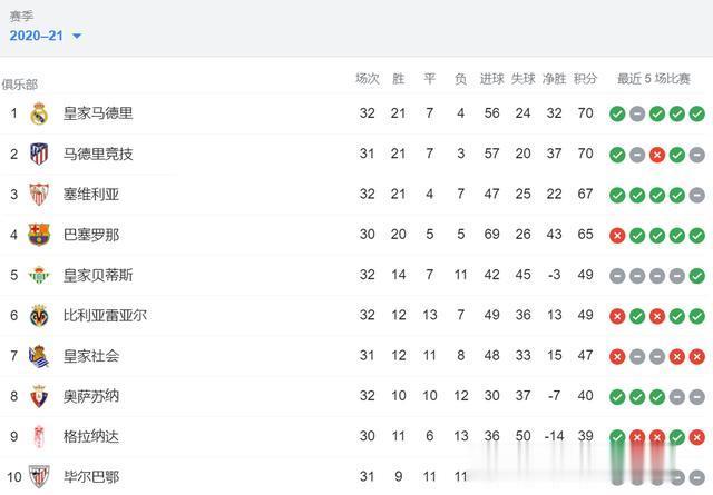 马竞本轮将迎战韦斯卡,如果能够拿分,他们就将反超皇马重回第一。塞维利亚则在多赛两轮的情况下积67分反超巴萨排名第三,巴萨30轮过后65分排名第四。