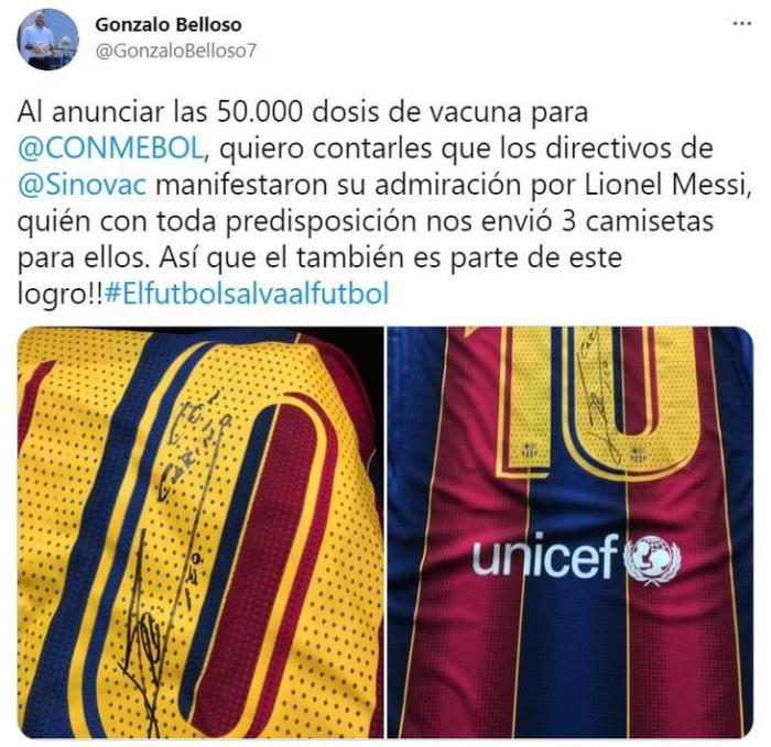 在南美足协宣布得到中国科兴公司捐赠的50000支新冠疫苗后,我还想告诉你们一件事。中国科兴公司的经理们对梅西很敬佩,梅西也愿意为我们表达感谢并赠送给他们3件签名球衣,所以梅西也是这项伟大成就的一部分!!