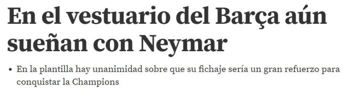 《世体》表示,巴萨目前有众多转会传闻,但是在这些传闻中,巴萨更衣室最希望的还是内马尔能够回归,尤其是那些曾和内马尔一起踢过球的老队友。