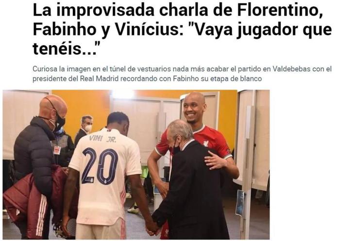 《马卡报》表示,在比赛结束之后,老佛爷一如既往前往皇马更衣室看望球员,此外,他还偶遇了利物浦中场法比尼奥。