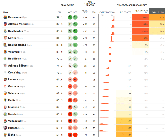来源:直播车04-07 19:32直播车讯 西甲29轮过后,马竞在西甲积分榜上的领先优势已经变成了1分,这是所有人都没有想到的,此前马竞可以说是西甲夺冠最大的热门球队,他们曾经一度领先皇马、巴萨12分之多,但是现在马竞已经下滑了,他们虽然有积分优势,但是各大媒体已经不看好马竞夺冠了。近日,著名数据网站“538”更新了本赛季西甲夺冠几率,其中巴萨排名第一,而马竞仅排名第二,皇马位居第三。