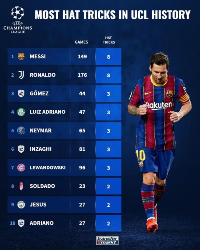 直播车讯德国转会市场网日前盘点了欧冠帽子戏法次数最多的球员,梅西和C罗毫无争议地排名第一。
