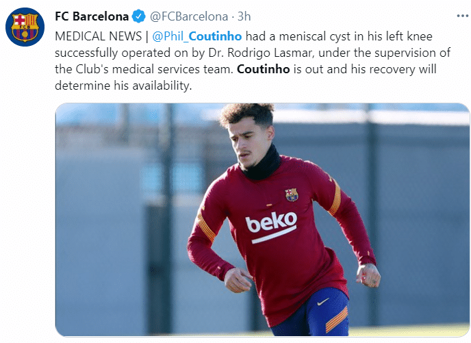 巴萨官方: 库蒂尼奥手术成功, 缺阵时间未定