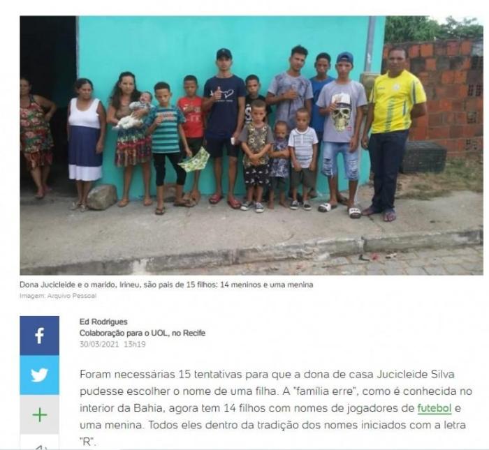 科鲁兹接受巴西当地媒体采访时表示,生这么多孩子是因为他们热爱足球:“当时登顶世界杯的巴西队里,有6位名字带有字母‘R’的球员,所以我告诉妻子,我会以此来给我们的孩子取名。”