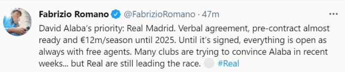 直播车讯据意大利名记罗马诺报道,阿拉巴已经与皇马达成口头协议,双方签约4年,年薪1200万欧元。